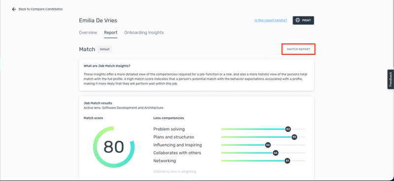Switching between templates is effortless within the compare candidate page. With a single click, Administratorsand Recruiters can move from one report to another during your review session. Any notes or summaries you create in a template are saved automatically, ensuring your work is never lost – even as you explore different perspectives. While the Match Report always resets as the default view when you return, your saved summaries and notes will immediately reappear when you revisit another template. Additionally, each report can be printed to share with colleagues or use in interviews.