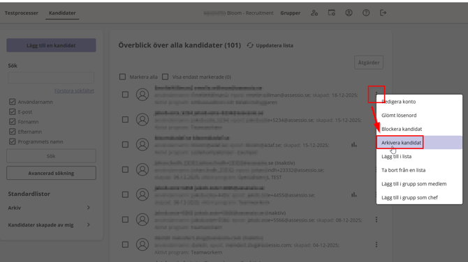 Om du vill arkivera en kandidat går du till "Kandidat" fliken. Sök upp den kandidat du vill arkivera, klicka på de tre punkterna till höger om kandidaten. I denna meny ska du välja "Arkivera kandidat".
