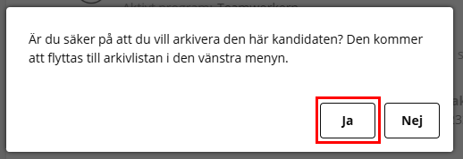 Denna pop-up ruta dyker upp när du klickar på "Arkivera kandidat". Klicka på knappen "Ja" för att slutföra arkiveringen av kandidaten.