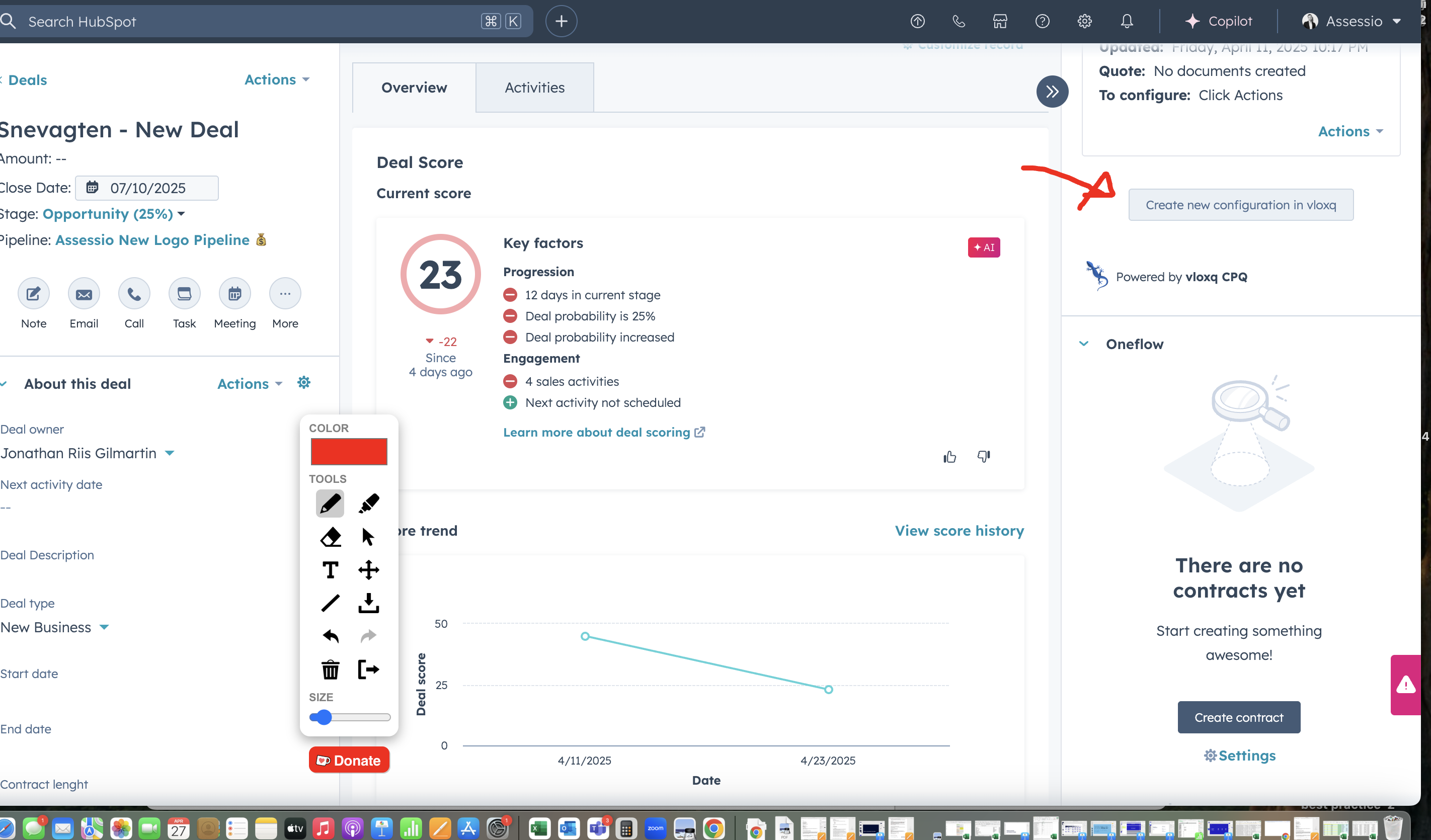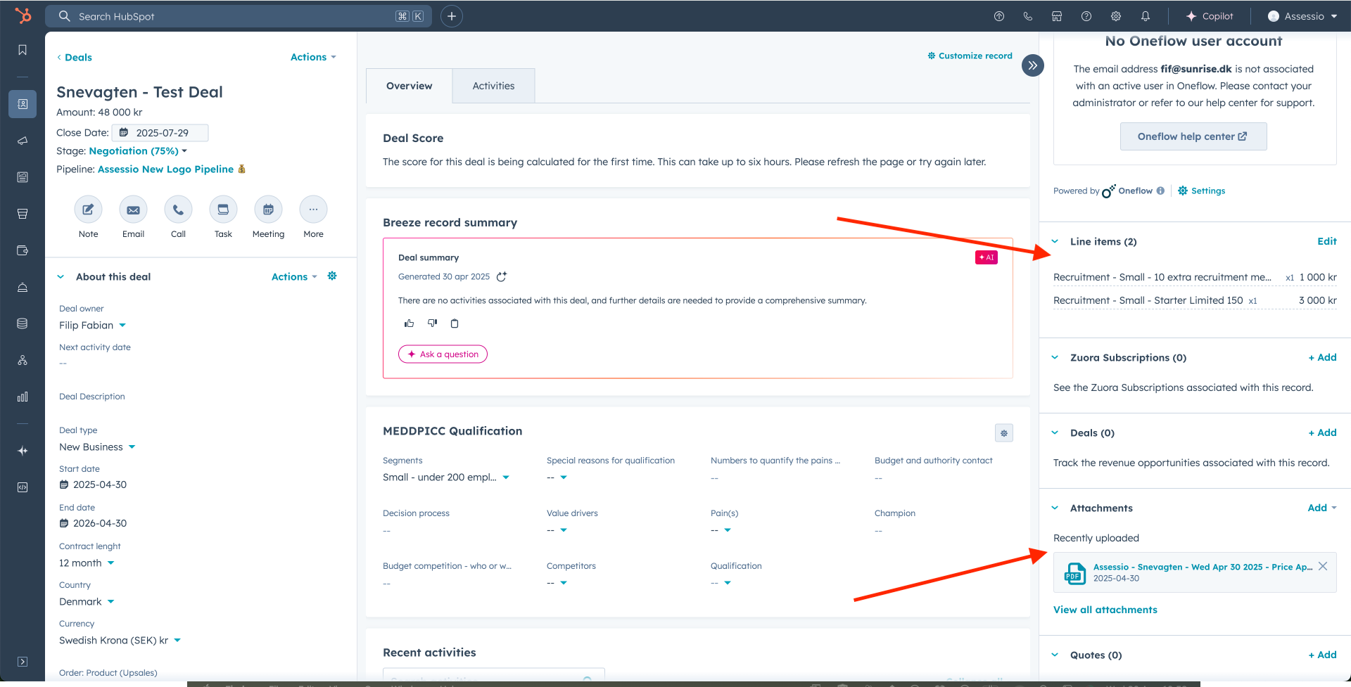9. Information automatically added to deal in HubSpot → Line items were created and the created Quote was added to Attachments