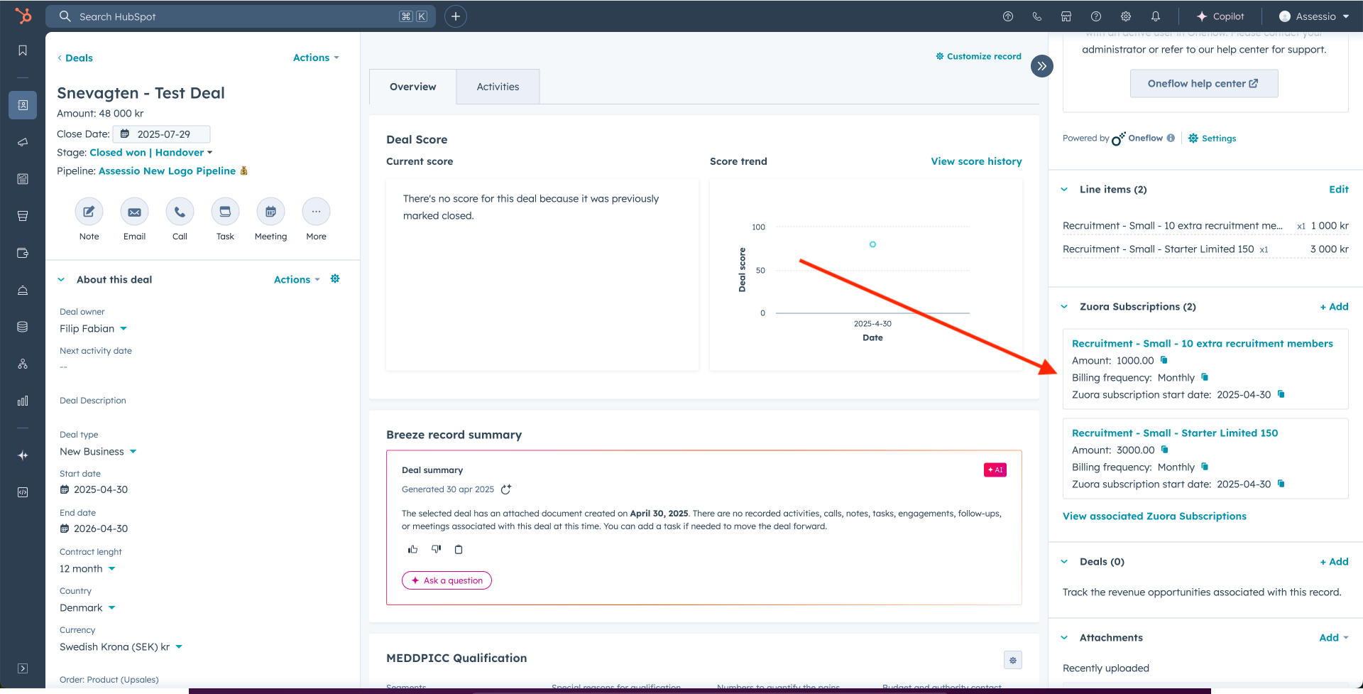 A point here, is how Zuora works. So if you have one company with one contract and subscription. If you make changes to that contract/subscription, Zuora is using versioning to track this, so you could see that a certain contract has changed x amount of times and the development in MRR, terms, products etc. This is exactly what Assessio needs, and therefor we need to make sure HubSpots data is supporting that.