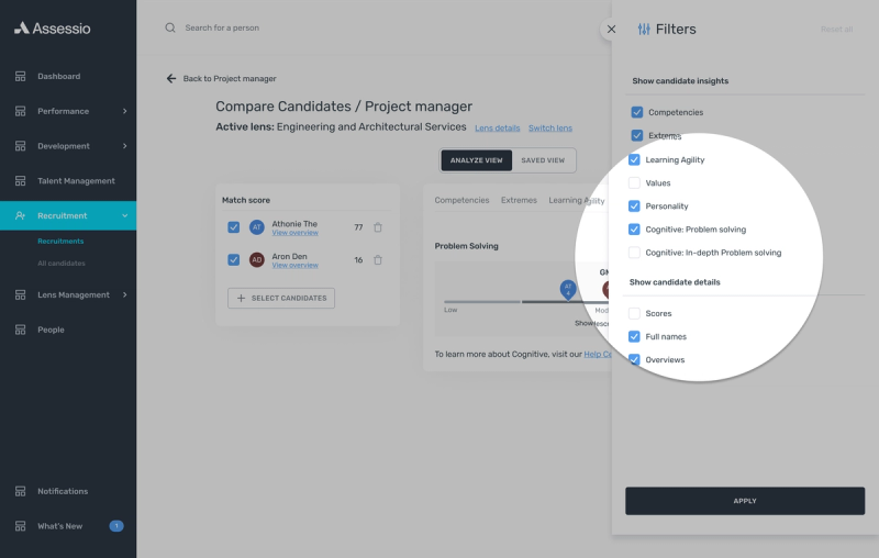 Recruiters and Recruitment Admins can now decide if they want to share Personality, Cognitive or both insights with Recruitment Members and Hiring Managers. When creating the Saved view, select the corresponding filters.