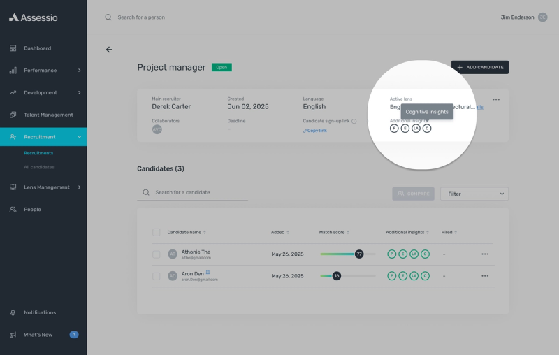 The badges on the Recruitment details reflect this change. They indicates the status and availability of the Personality (P) and Cognitive (C) insights.