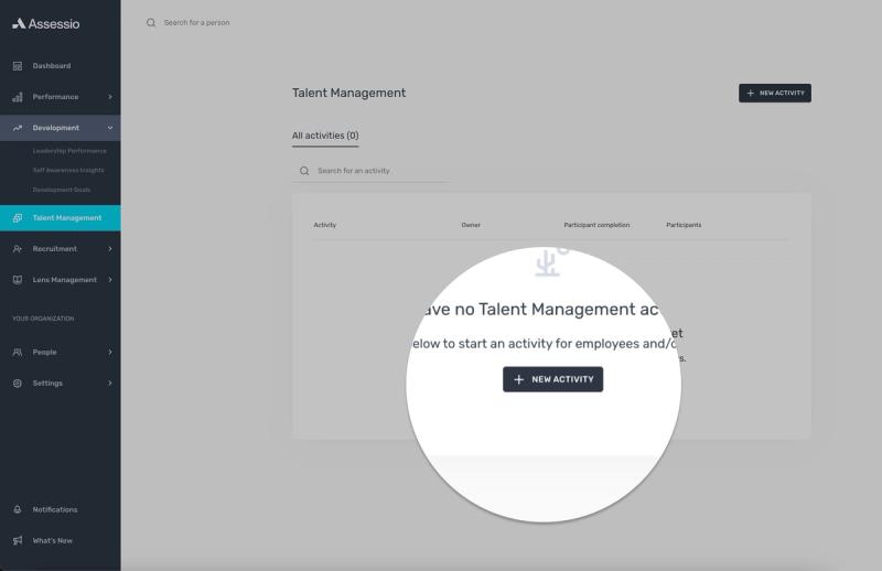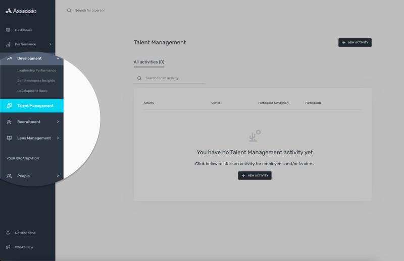 In order to start or follow up on a People evaluation activity, click on ‘Talent Management’ in the menu on the left. Only users with the Development Admin role in the platform have access to the Talent Management menu option and your organization needs to have the People evaluation activities add-on activated for the Development module.