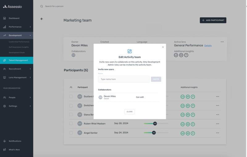 You can invite other Development admins to collaborate on the activity and you can of course analyze the results of the assessments.