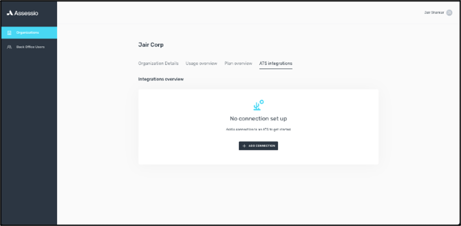 The first step is to activate the recruitment module, since without this active, the “ATS connection wizard” is not visible. Once activated, the back-office user can navigate to the ATS integration tab and select “+ ADD CONNECTION”.