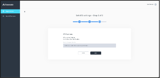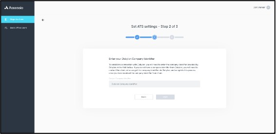 The next step asks the back-office user for a Jobylon Company Identifier. This is a UUID that Jobylon generates when they create the client’s organization in Jobylon. This will ensure that the requests the client makes via the integration is processed by the correct organization in the Assessio platform.