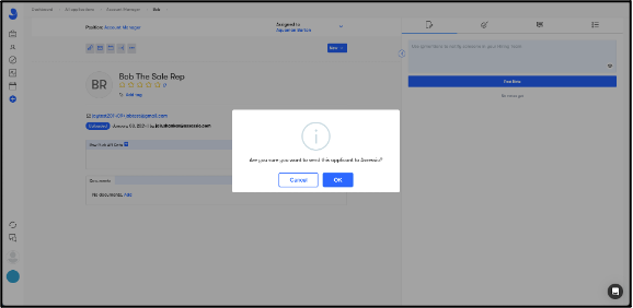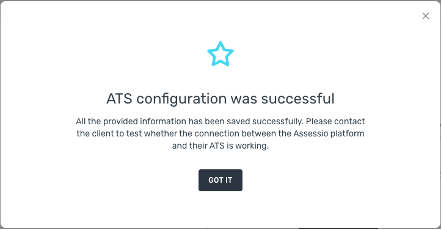 Clicking on save produces a confirmation modal. It should be noted that the ATS integration is not established as yet and is just an indication that the information has been saved.