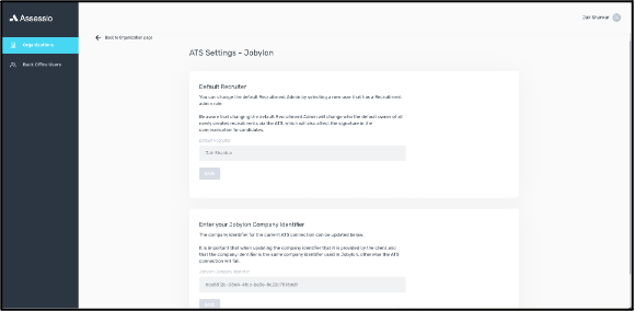 Selecting “ATS settings” takes the user to a dedicated settings page, where the back-office user can change the default Recruitment Admin or update the Company Identifier.
