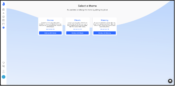 A recruiter creates what is called a “Job” in Jobylon. The first step to is choose a “theme” for the job. This refers to how the job will look when published. The client will know what they prefer. For the example, the “Classic” theme was selected.