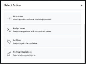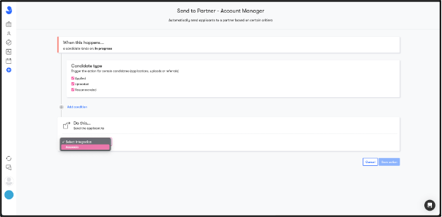 Selecting this option, will take the user to a separate page, whereby they need to select which integration they would like to have triggered when a candidate enters this step in the pipeline.
