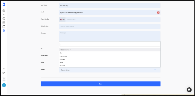 The user can now navigate to the job and add a new candidate. When creating a candidate to be added, one of the fields is “Status”. By setting the candidate’s status to “In progress”, they will automatically be sent an invite to the Assessio assessments.