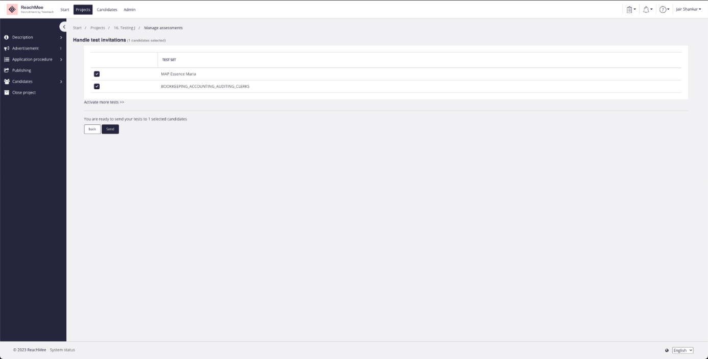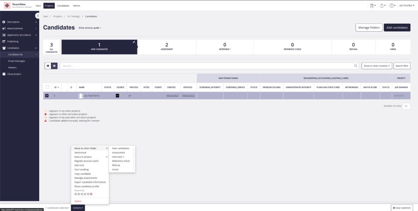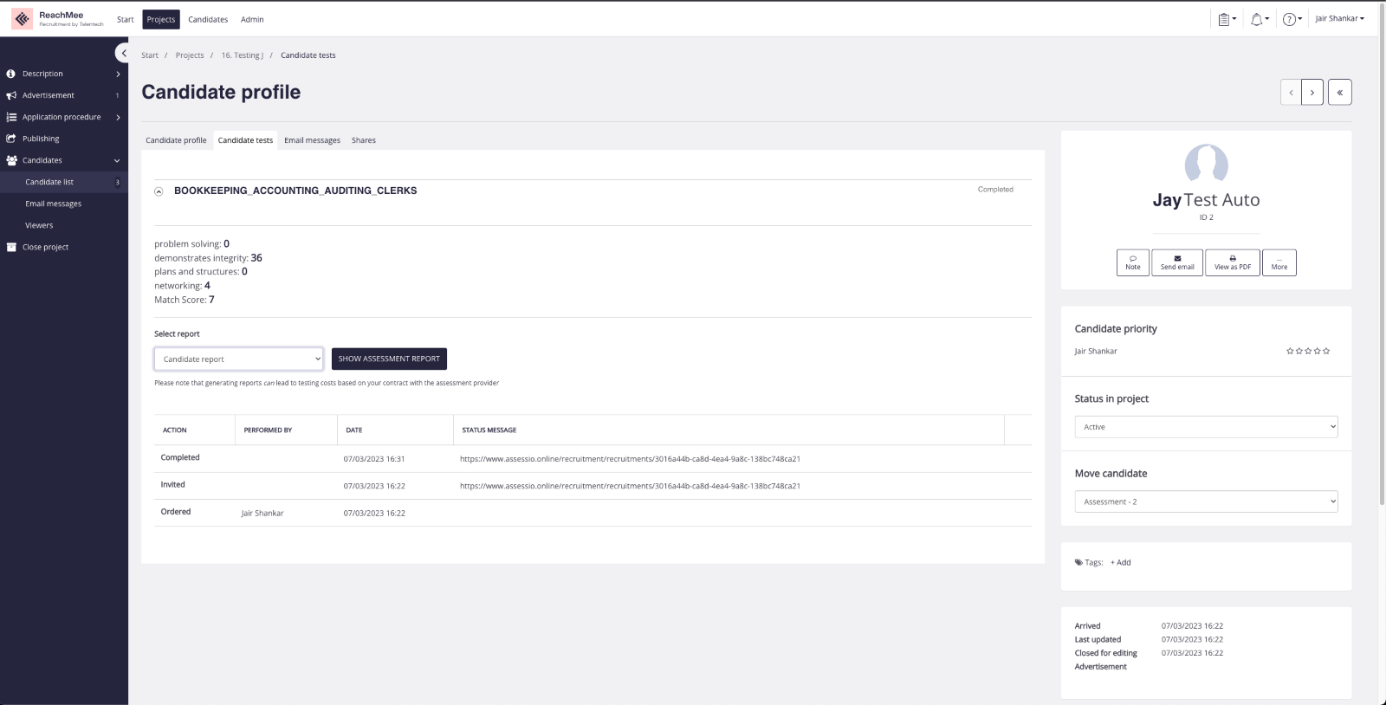 In the candidate section, the recruiter can create candidates and add them to the project. When candidates are moved into the Assessment folder, they are sent to the platform and invited to complete the assessments corresponding to the selected lens.