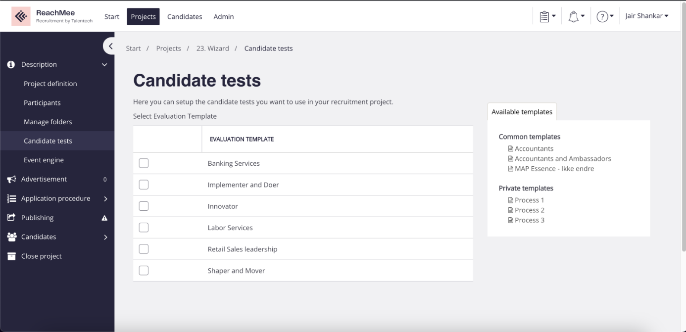Under the Candidate tests tab, the recruiter chooses which lenses to use for the project, referred to as “Evaluation templates” in ReachMee. The lenses listed in ReachMee reflect the lenses selection authorized by the Recruitment Admin in the Lens Library of the Assessio platform. The recruiter can select one or more lenses for a project. If several lenses are selected for a project, a recruitment will be created for each lens in the Assessio platform.