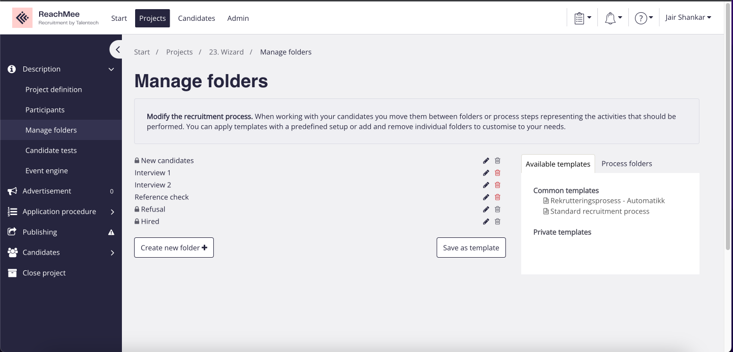 In ReachMee, recruitment process swim lanes are referred to as “Folders”.