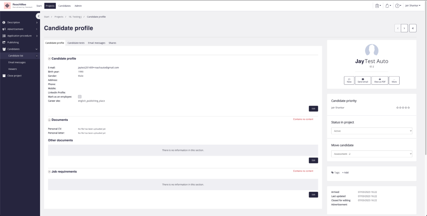 Once created, the recruiter will be able to click on the candidate’s name. This will bring the user to the candidate’s profile within the Project. The page will look as follows: