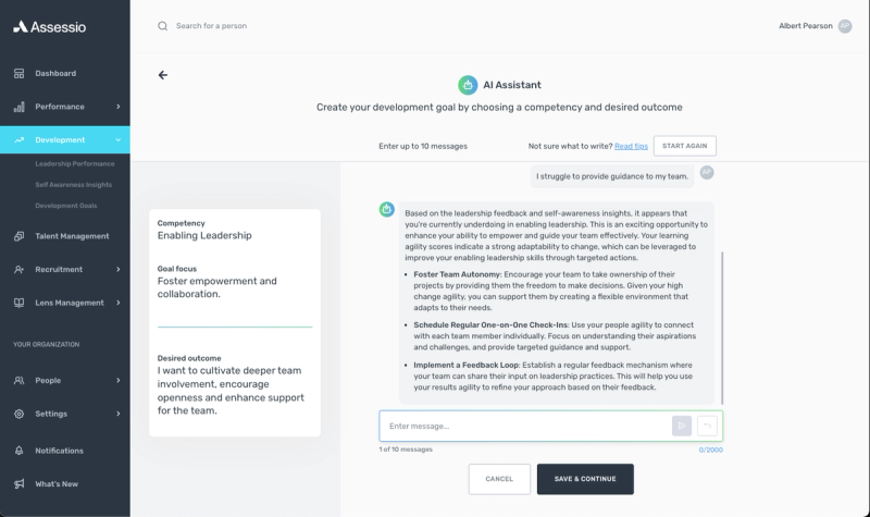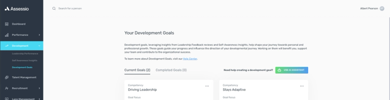 Choosing a development goal for yourself is one of the first steps towards professional growth. And the goal you choose will guide your development for some time, so choosing the right on is important. But it can be hard to pick a good goal for yourself when there are so many to choose from in the Assessio platform. This is where the AI assistant can help.